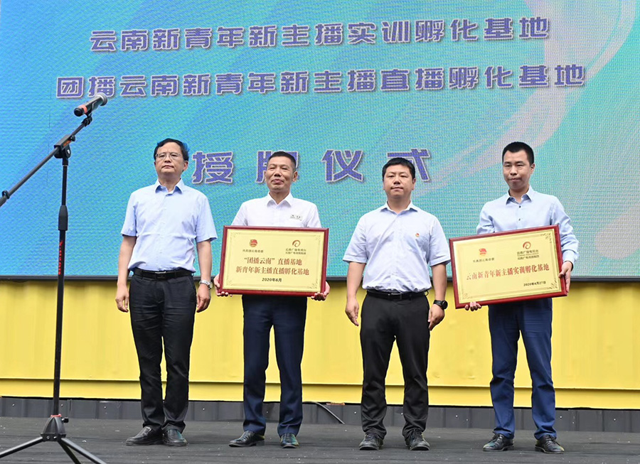 活動(dòng)現(xiàn)場,共青團(tuán)云南省委黨組成員、副書記趙攀峰,云南廣播電視臺(tái)黨委委員、紀(jì)委書記曹渭海為云南紡織(集團(tuán))股份有限公司、云南天度投資集團(tuán)有限公司頒發(fā)了“團(tuán)播云南”直播基地、云南新青年新主播直播基地牌匾。